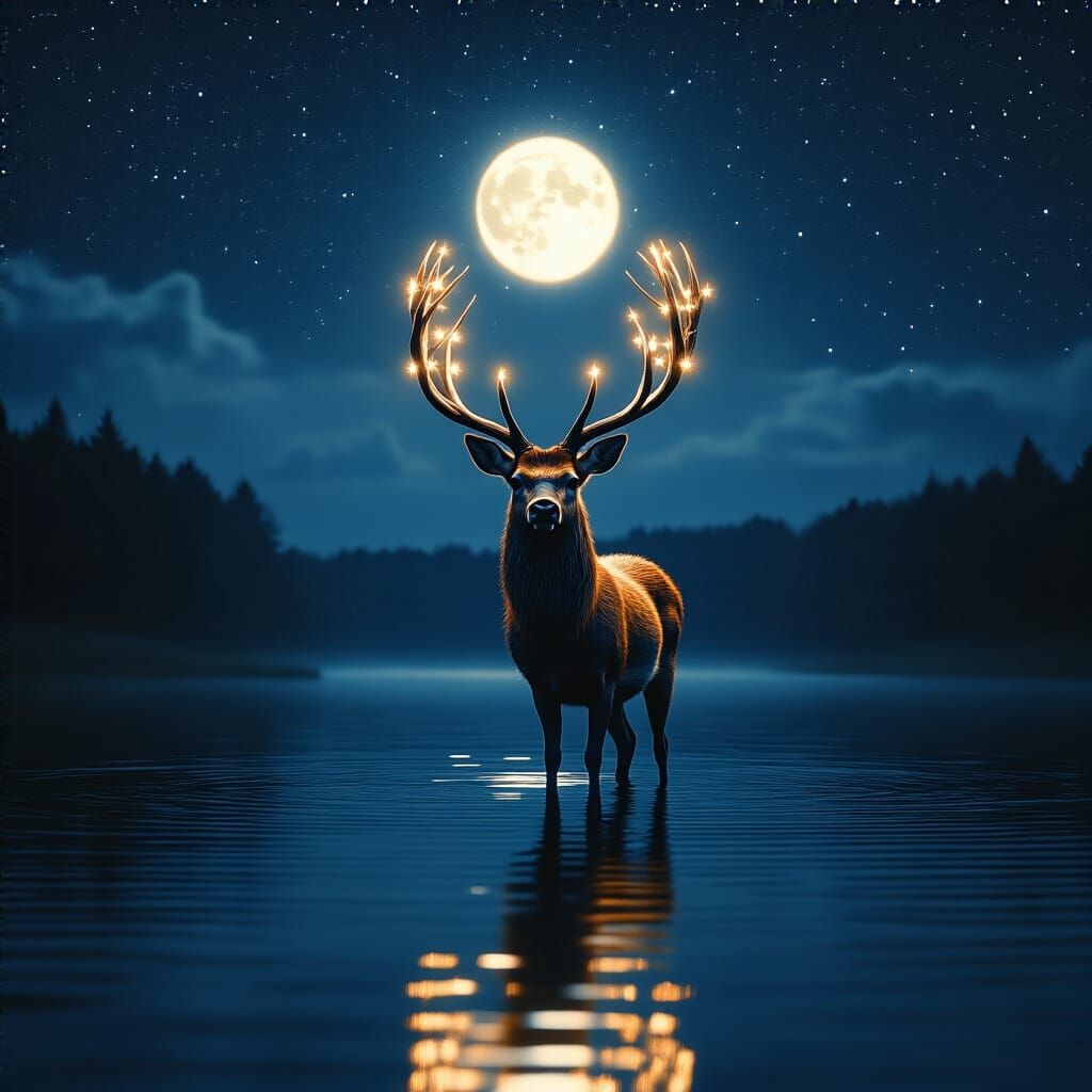 A hyperrealistic image of a stag standing in a lake under the moonlight. The stag's antlers are adorned with twinkling stars, creating a cinematic and atmospheric scene with dramatic lighting.