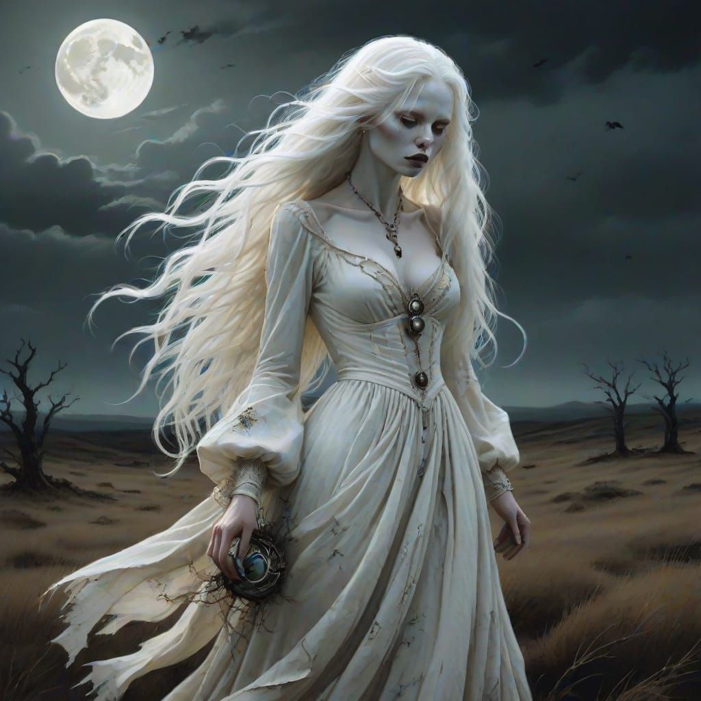 A haunting image of a spectral woman on a desolate moor, illuminated by moonlight. This dark fantasy art evokes a sense of mystery and sorrow, rendered with intricate detail.