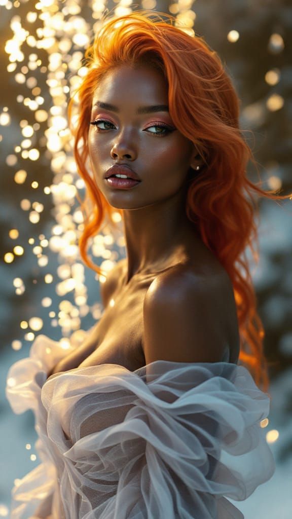 This image showcases a dark-skinned woman in a sculptural, avant-garde aquarium-inspired dress. Soft golden light enhances the surreal elegance and hyper-realistic detail.