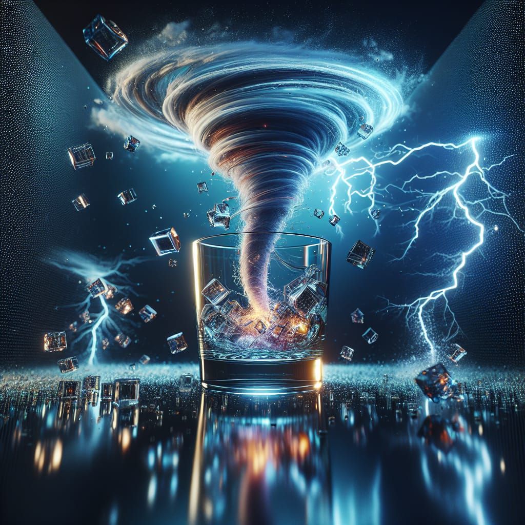 This image shows a glass cup with a miniature 3D world above it, featuring a tornado with thunder and lightning. It has dynamic lighting and detailed, hyper-realistic 3D graphics reminiscent of a cinematic scene from a videogame.