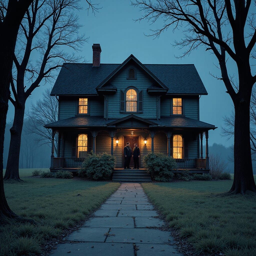 This image showcases a spooky haunted house scene in a manga style. The artwork features flat, cel-shaded coloring and cinematic lighting, reminiscent of anime wallpapers and drawn art.
