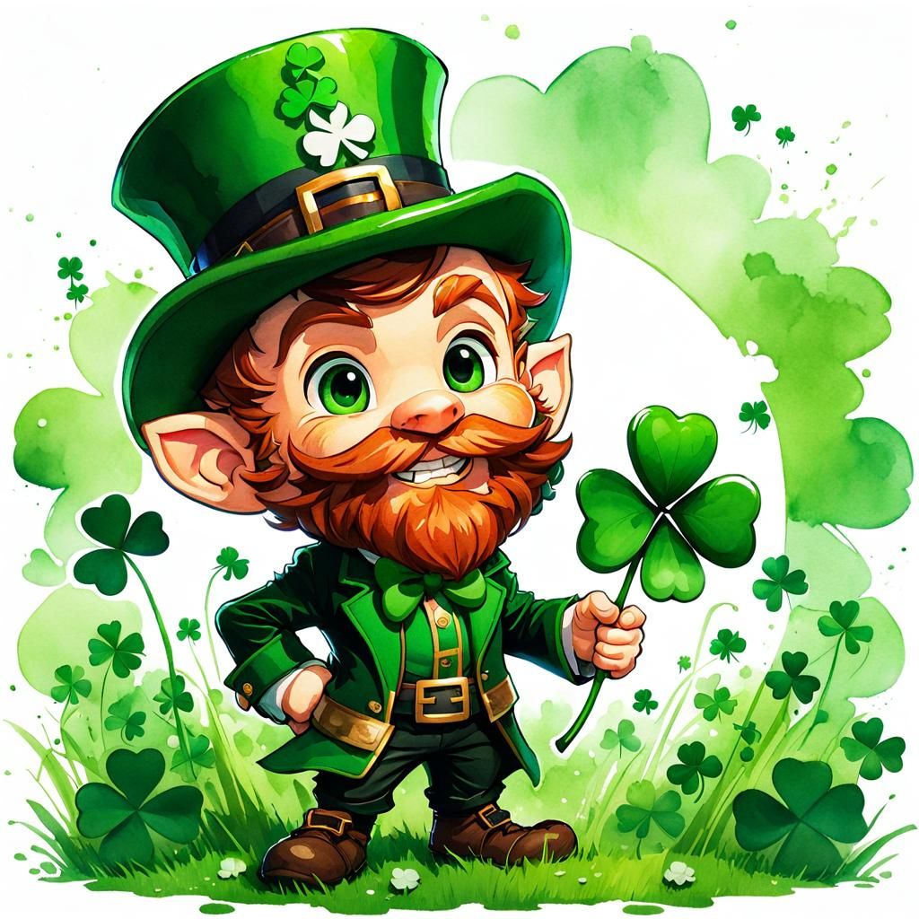 This image shows a whimsical chibi-style leprechaun holding a four-leaf clover, set against a backdrop of clovers, rendered as watercolor concept art with ink wash and splash effects.