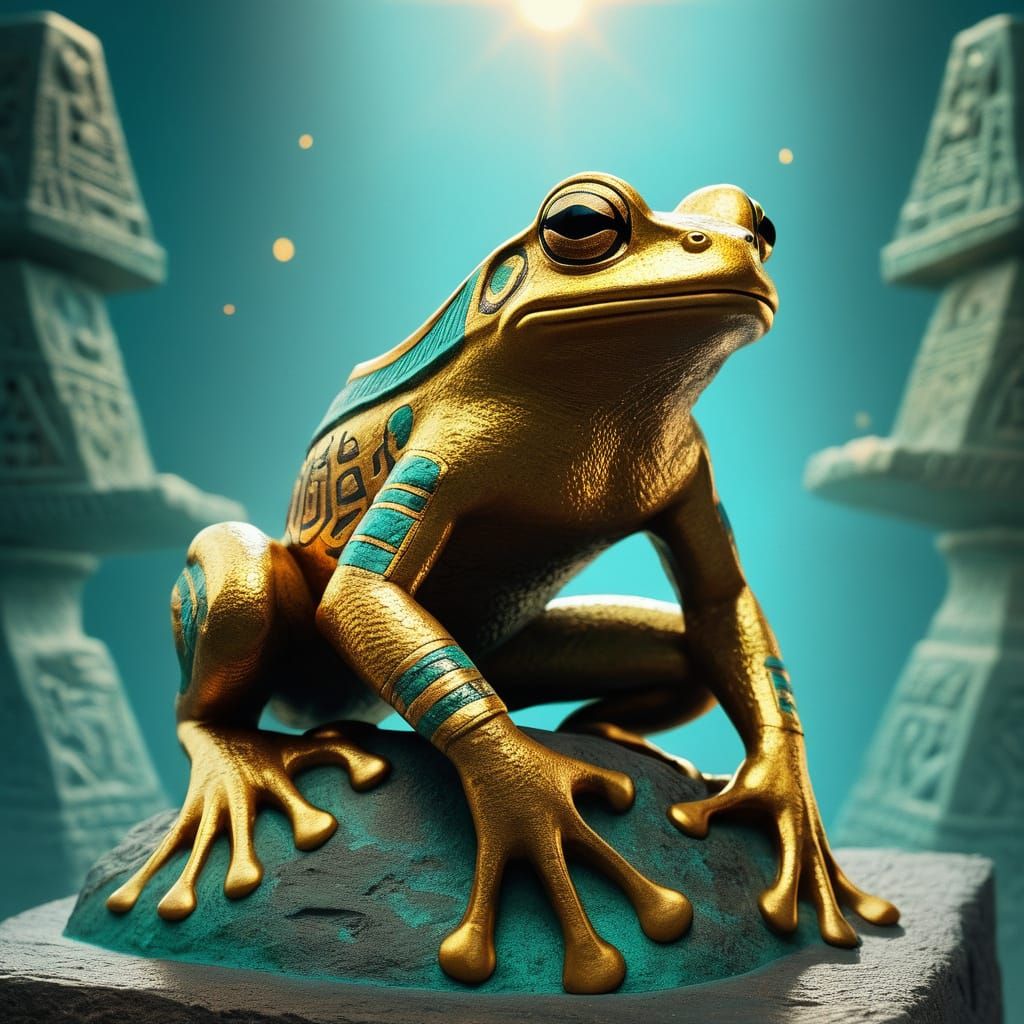 This image shows a frog wearing a pharaoh's hat, standing on a pedestal with hieroglyphs. The ancient Egyptian artwork features golden light, turquoise skin, and warm sunlight.
