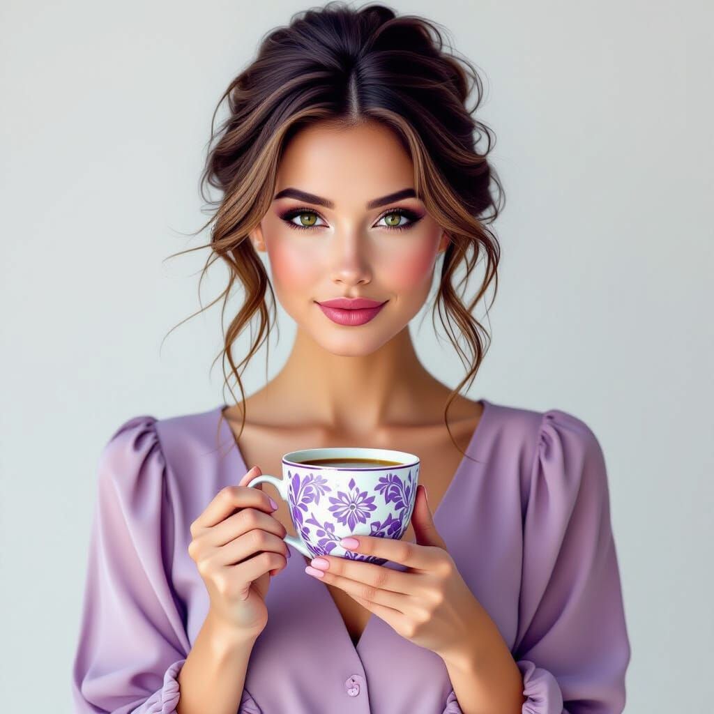 This image shows a beautiful young woman with geometric hair holding coffee. The portrait features a hyperrealistic digital painting style with sfumato, intricate shading, fractal patterns and zentangle elements.