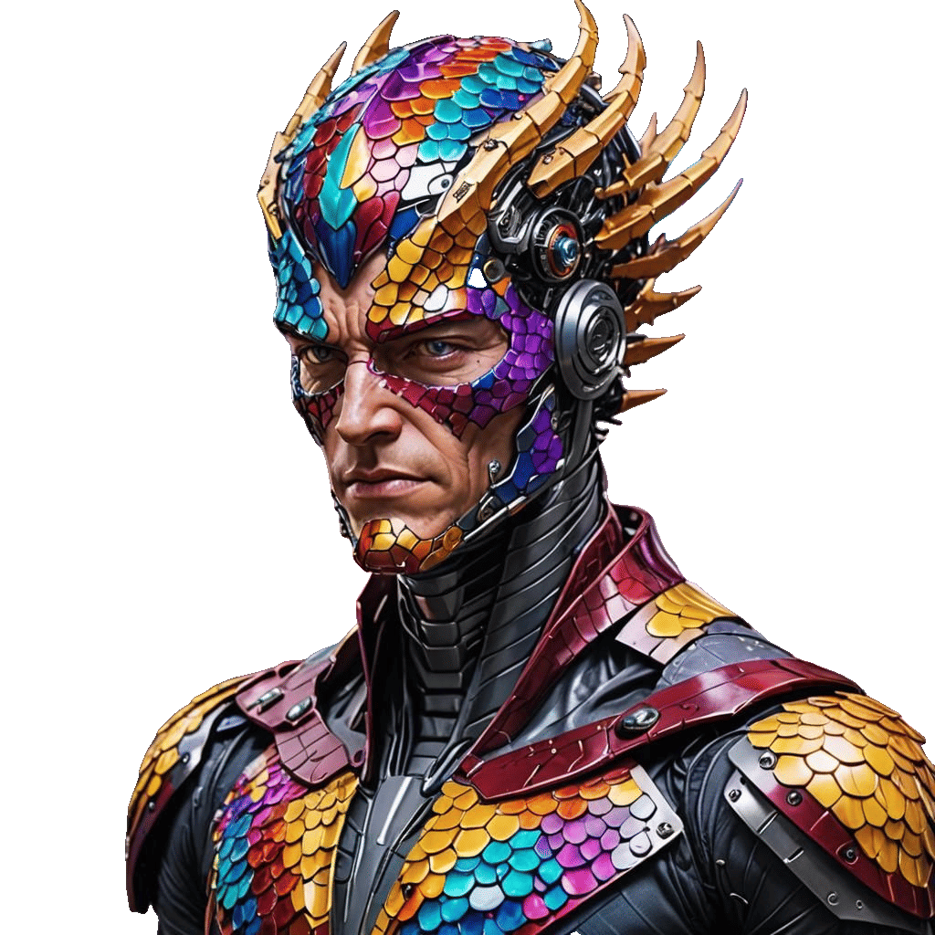 This image shows a half-human cyborg with dragon scale skin using their mind to hack the universe. The artwork is rendered in a vibrant, technicolor science fiction aesthetic.