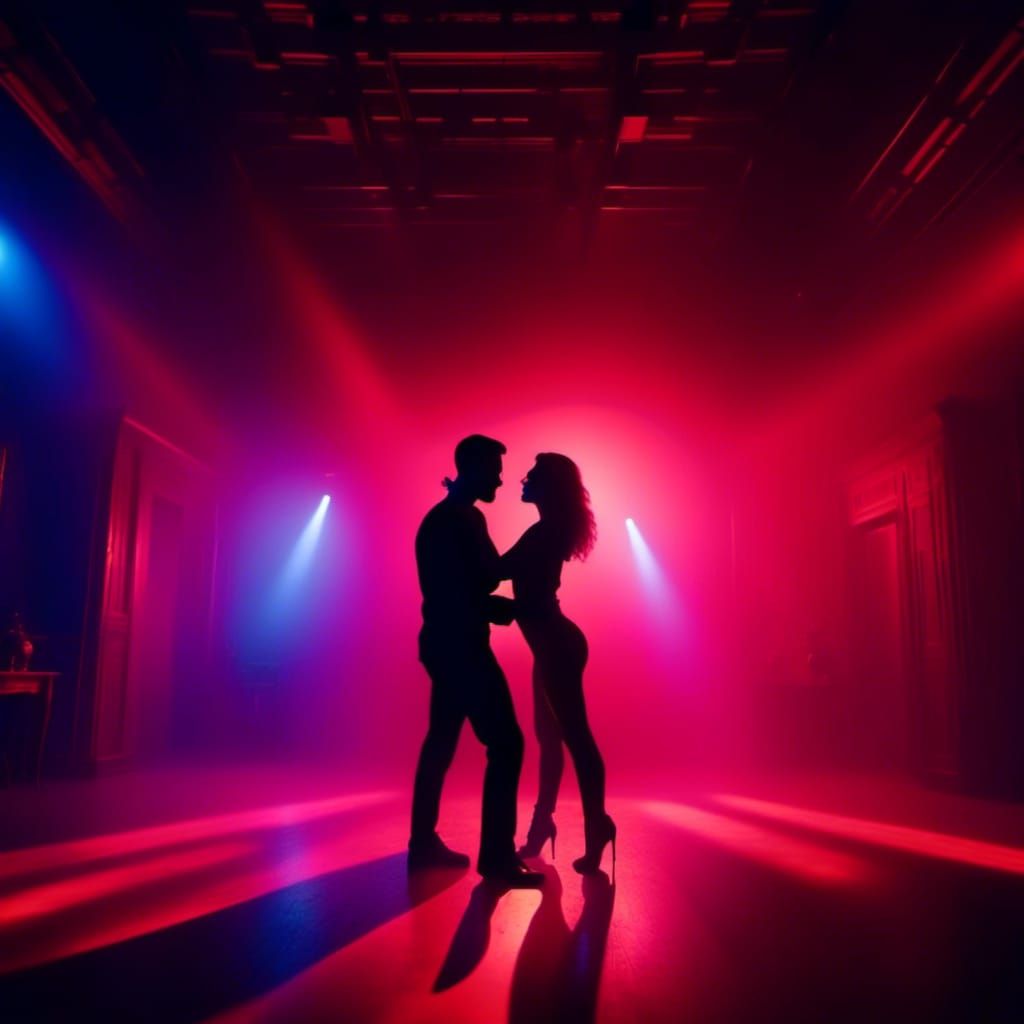<lora:our shadows:1.0> dark room, volumetric red and blue lighting, fog, man and woman dancing silhouette