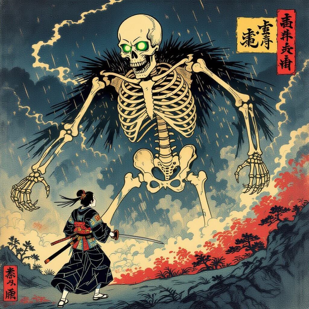 A striking Ukiyo-e style woodblock print shows samurai Takiyasha facing a colossal, glowing skeleton spectre in a dynamic, stormy scene. Bold lines and contrasting colors emphasize the dramatic tension.