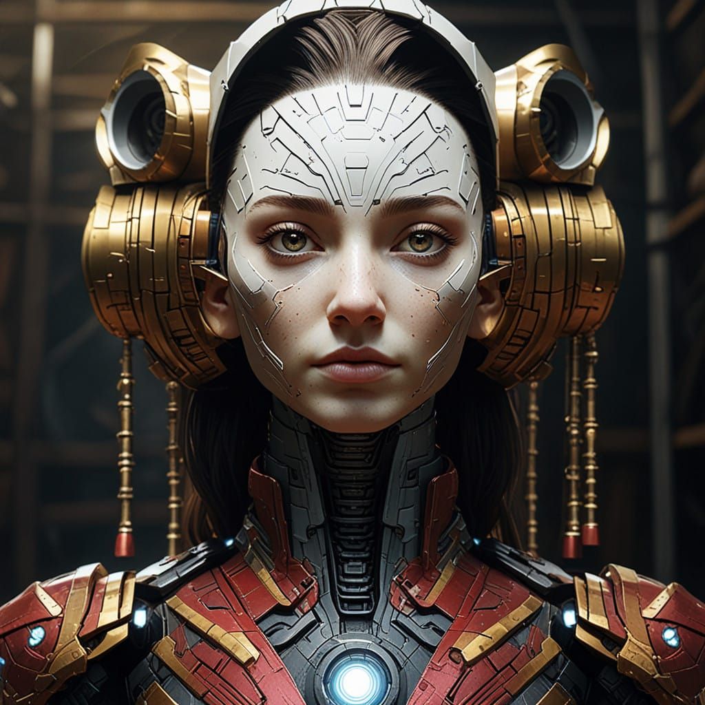 This image shows a majestic horse wearing a futuristic Iron Man suit, standing proudly in a high-tech barn with vibrant colors and dynamic lighting, reminiscent of a Marvel movie poster.