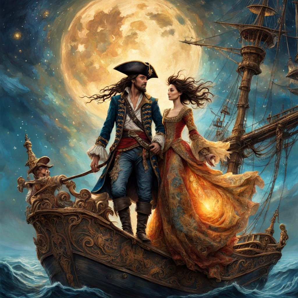 A striking picture of a pirate king and queen on a ship's deck. The artwork is in a baroque fantasy style, with golden light and dramatic shadows, showcasing intricate textures and ornate embroidery.