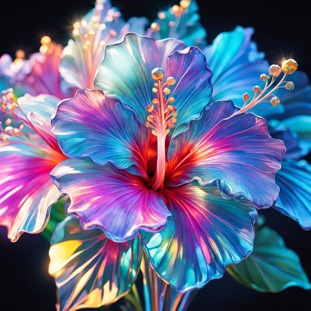 A hyperrealistic digital artwork showcasing a bouquet of translucent crystal hibiscus flowers. Features intricate details, vibrant color gradients, and ethereal luminescence, with cinematic lighting.