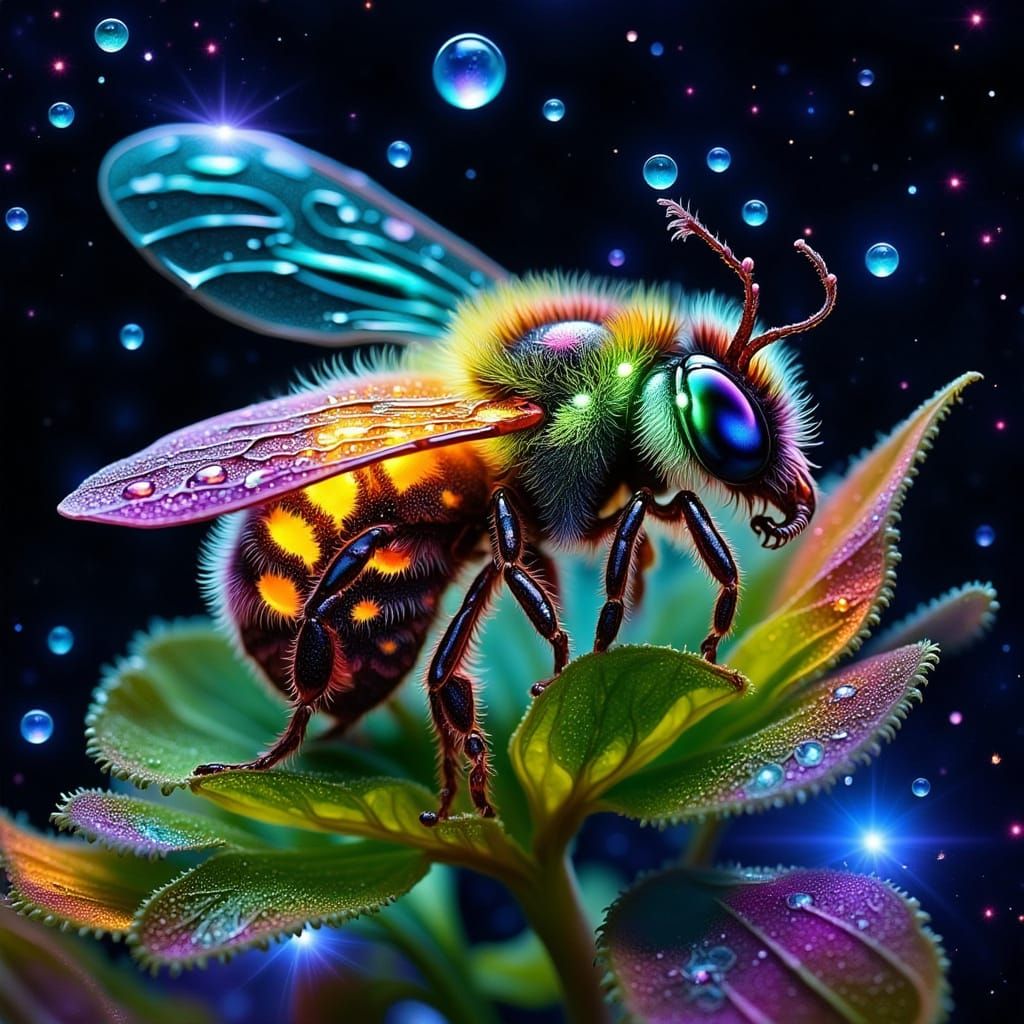 A close-up macro image of a cartoon bee sleeping peacefully in a flower nest under a starry galaxy sky. The alcohol ink art style features glowing elements and intricate details.