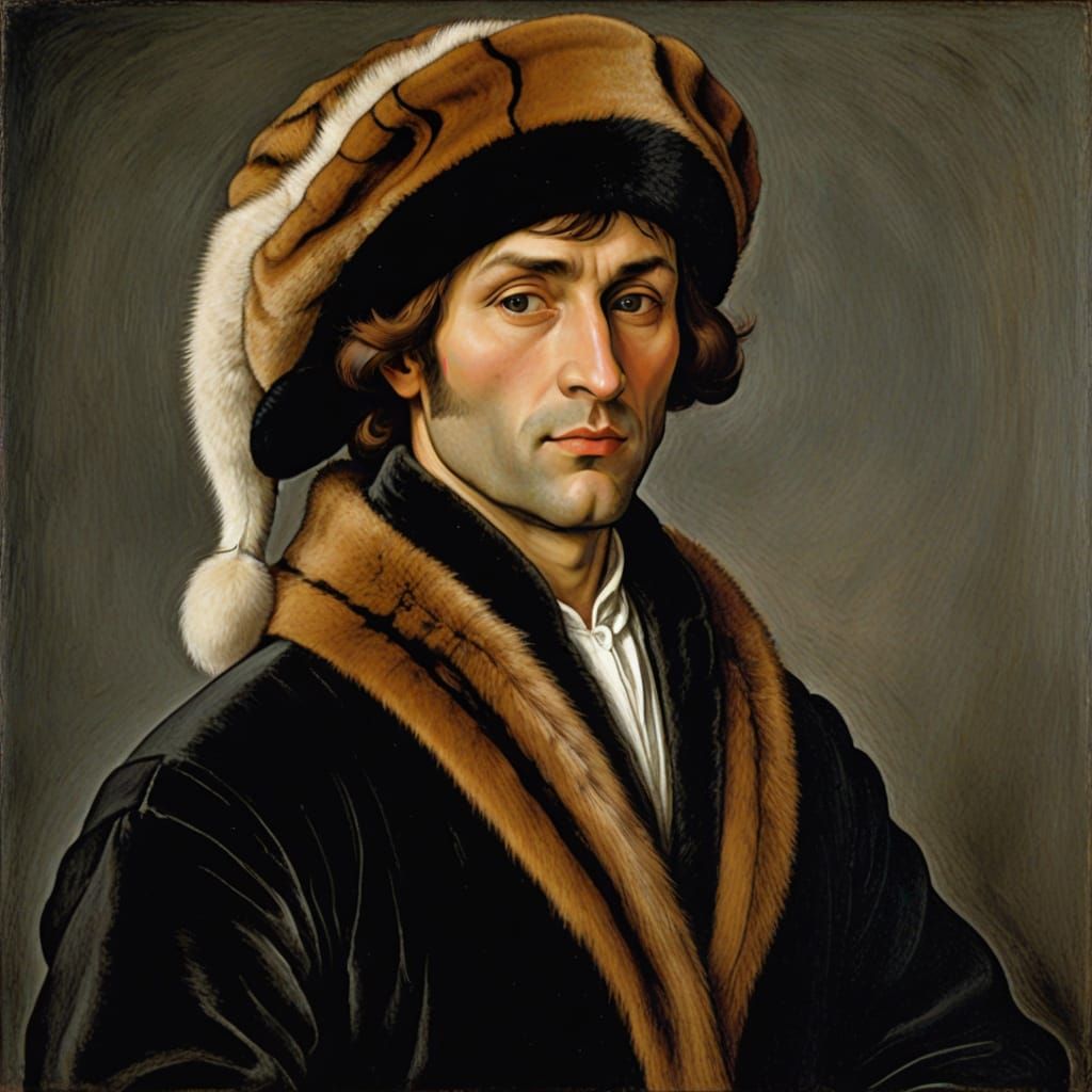 This image shows a stern-faced officer with a cyberpunk twist, inspired by the styles of Hans Holbein and Amedeo Modigliani, holding a shining granite in his hand.