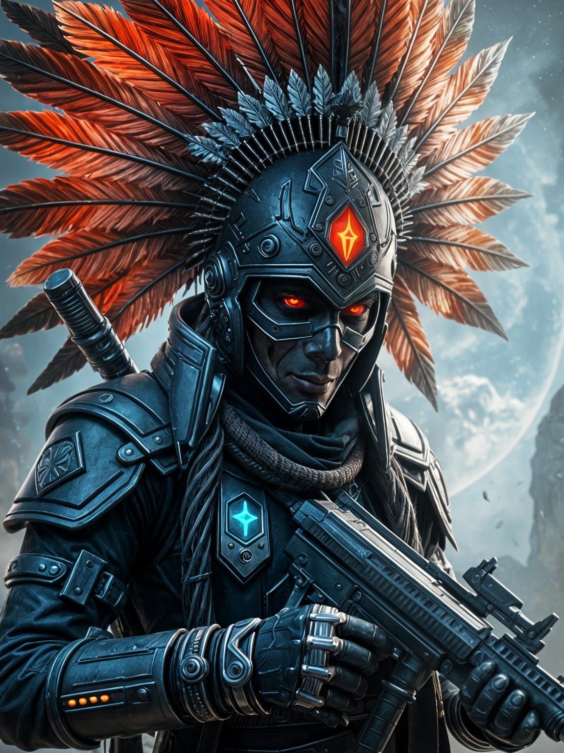 A striking picture of a futuristic Native American cyborg warrior. The figure wears an elaborate feathered headdress, rendered as detailed 3D anime art with breathtaking detail.