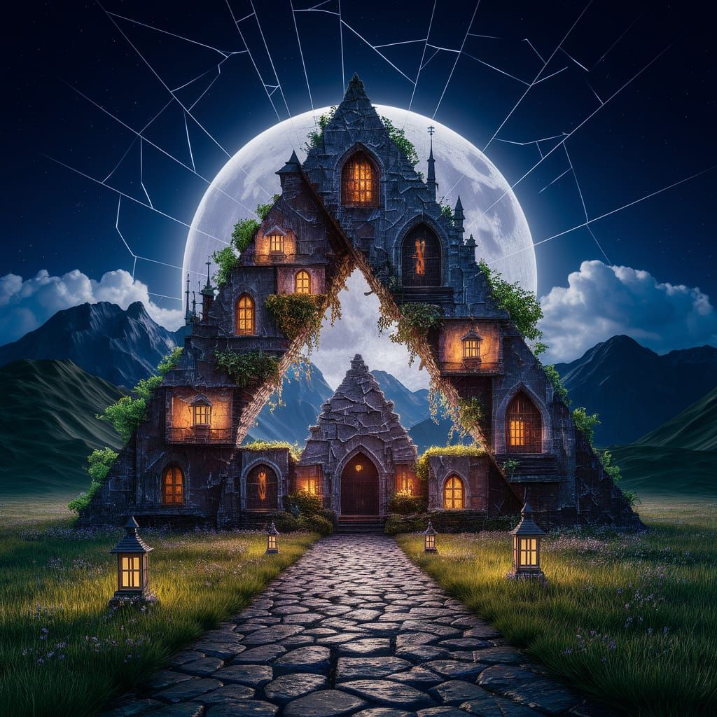 This image showcases a rustic fantasy village shaped like a Penrose triangle, rendered in a masterpiece acrylic painting style. Features medieval architecture, verdant flora, and dynamic moonlight illumination with a distressed texture.