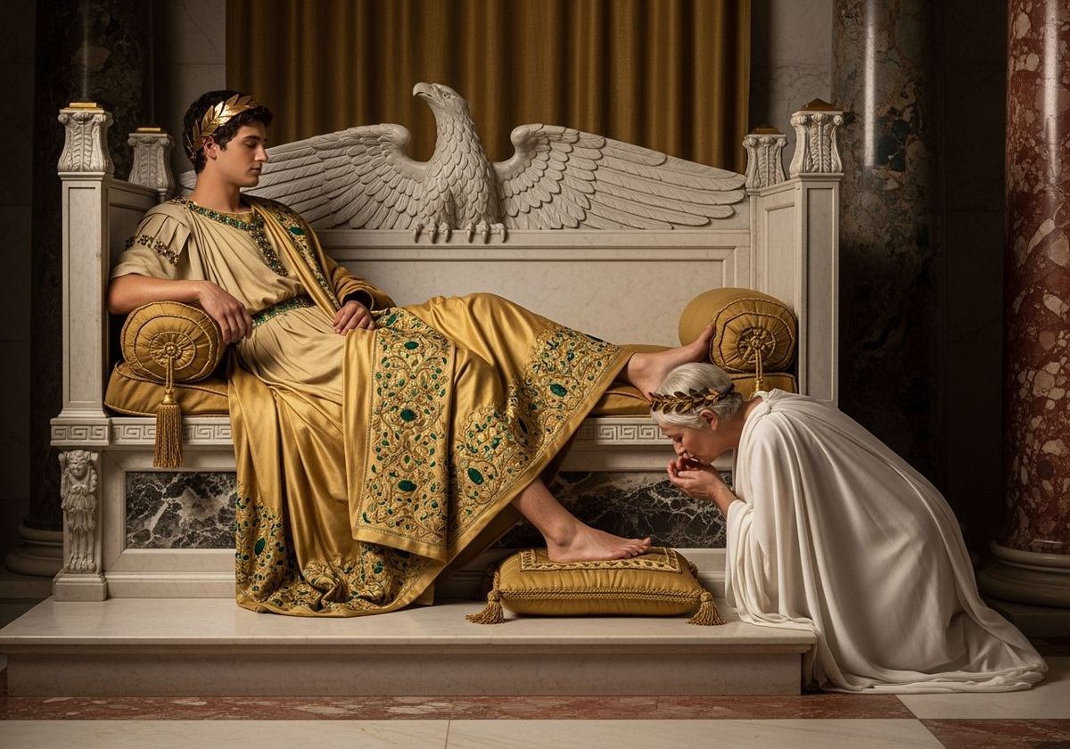 This image shows Emperor Nero in a gold toga reclining on a marble and gold triclinium in his throne room. A Roman senator kneels before him, kissing his feet in this photograph, reminiscent of baroque painting.