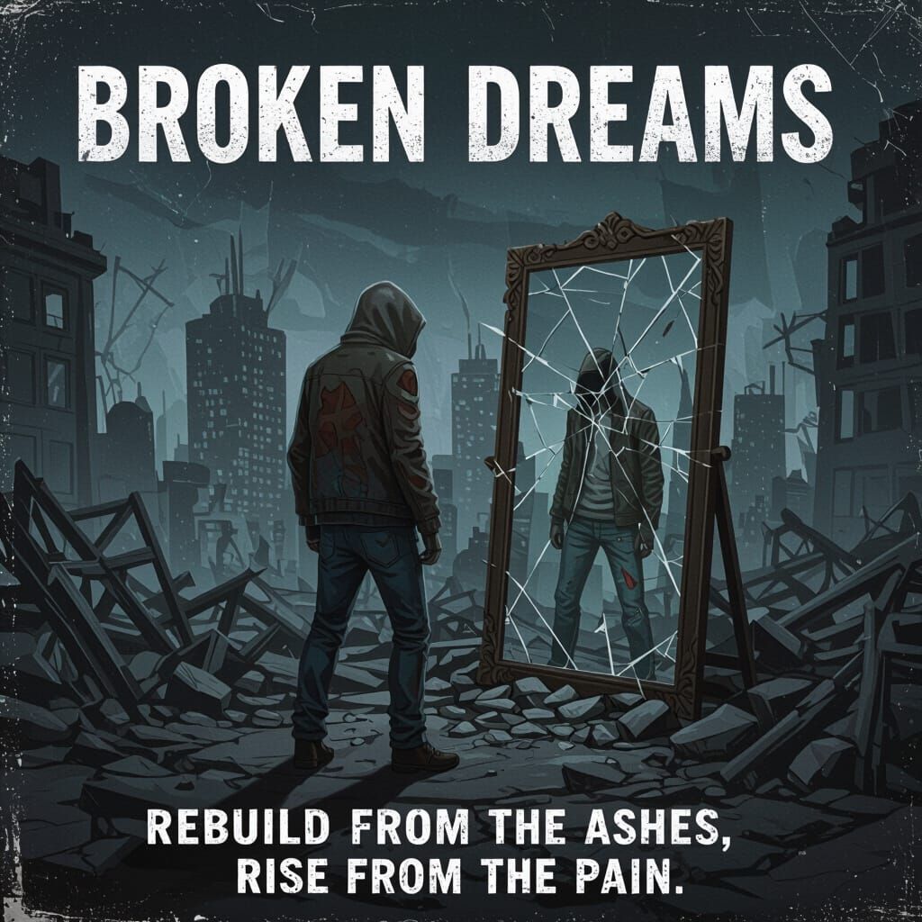 A desolate cityscape shows a lone figure amid the debris, mirrored in broken glass. The scene evokes street art with emotive undertones, featuring distressed text and a dark, moody atmosphere.