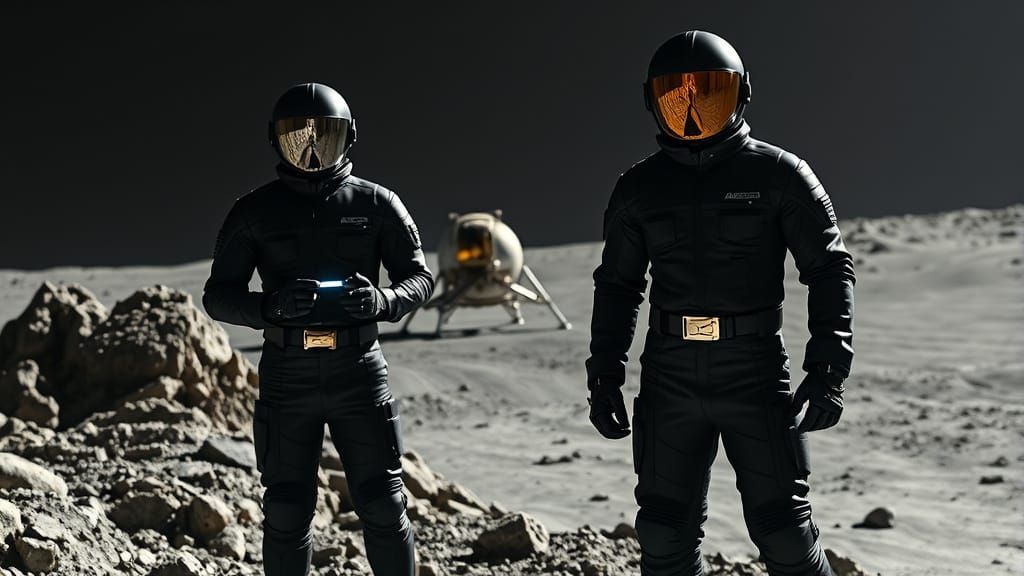 This image shows two agents in black suits on the moon. One holds a glowing device near the Apollo Lunar Module in a retro science fiction aesthetic.