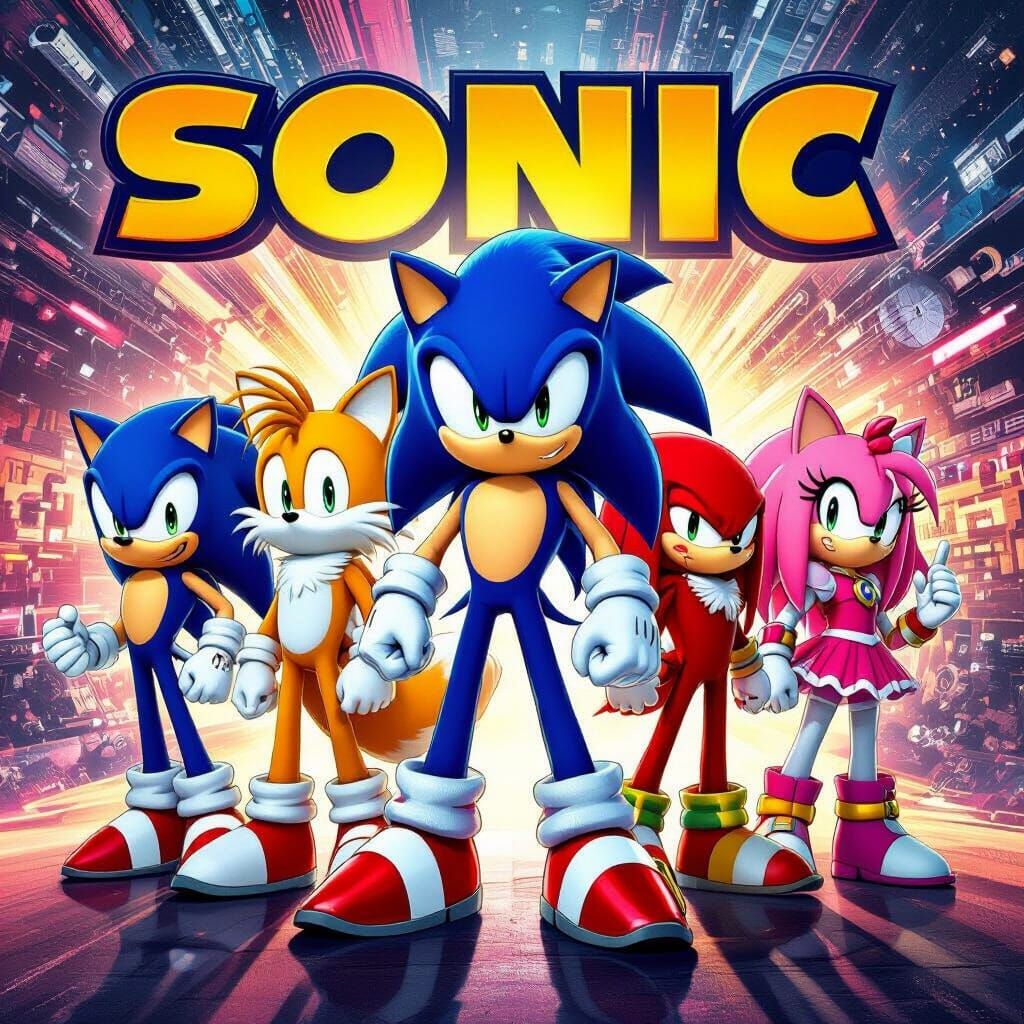 A dynamic movie poster showcases Sonic, Tails, Knuckles, Shadow, and Amy Rose in heroic poses. The image has a vibrant backdrop and a comic-book aesthetic, with metallic textures.