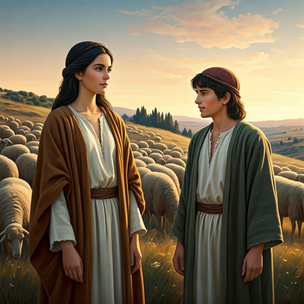 This serene image captures a young shepherdess lost in thought, surrounded by grazing sheep, as she stands with a handsome young shepherd in a tranquil landscape bathed in the warm, golden light of a setting sun, reminiscent of Pre-Raphaelite and Chagall-inspired dreamscapes.