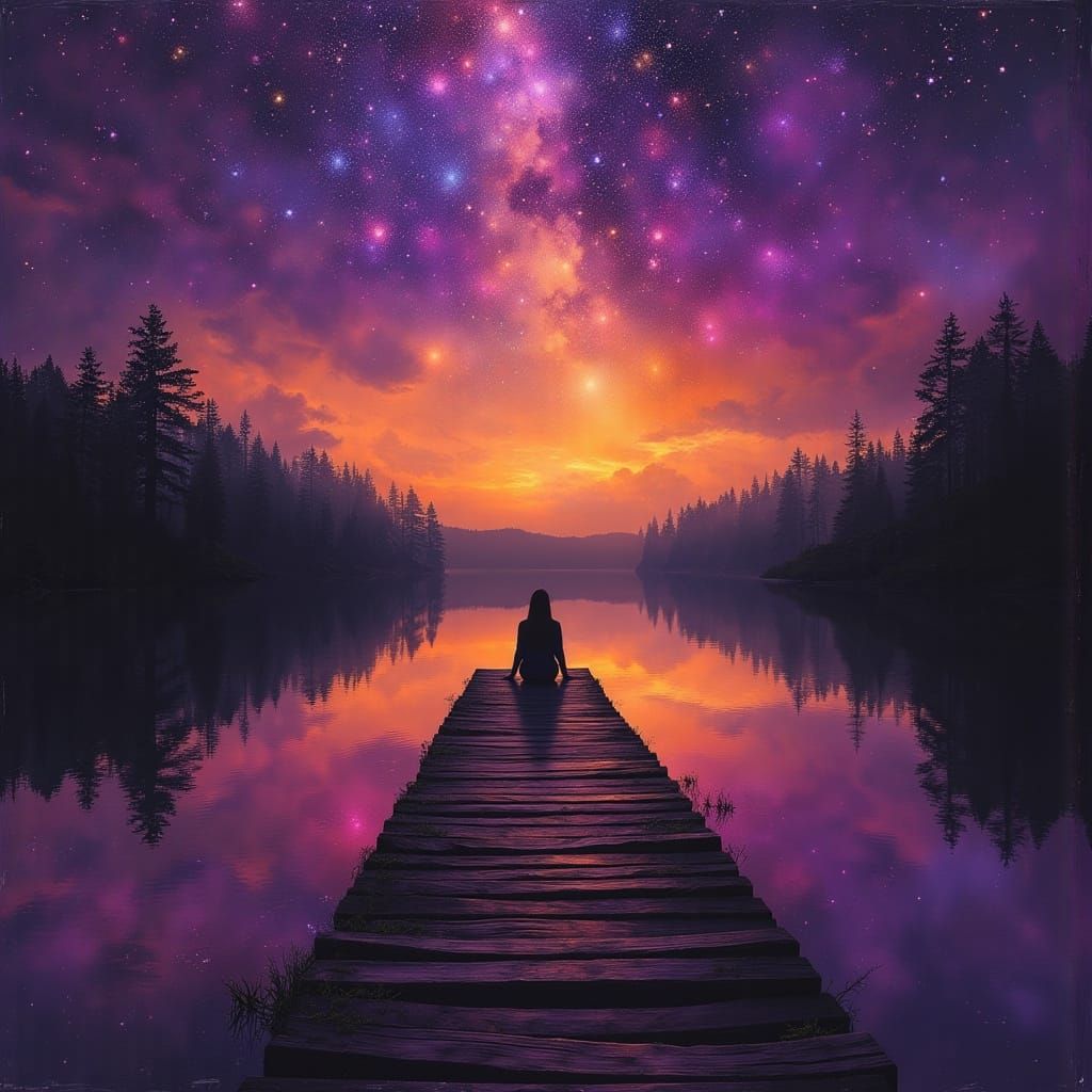 This image shows a vibrant sunset in shades of orange and purple, reflected in a tranquil lake. A woman sits on a jetty, gazing at a starry sky filled with falling stars. The scene is rendered as a highly detailed, photorealistic oil painting.