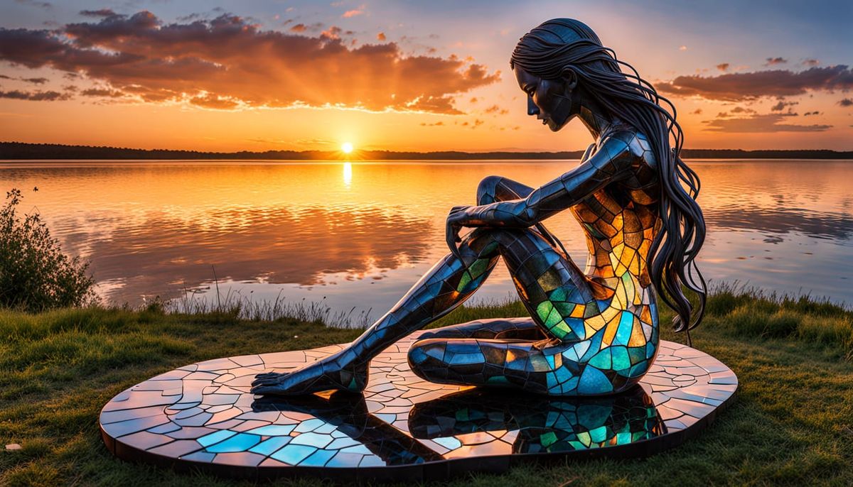 This image shows a fragmented sculpture of a woman kneeling at sunset. The artwork incorporates bio art with glowing creatures and symbolic elements, in a surreal collage of folklore and mythology.