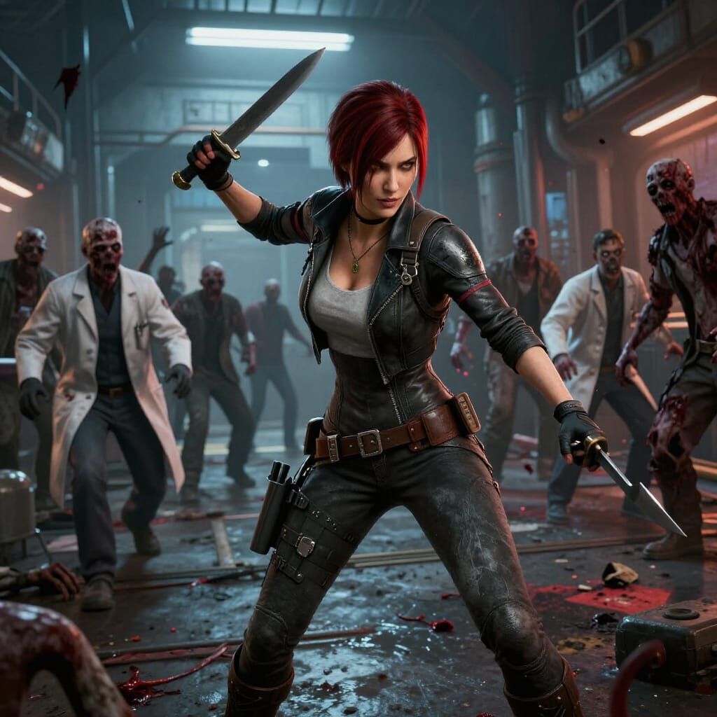 This image depicts a Resident Evil actress using blades to fight zombies in a biohazard facility with fleeing doctors. Features 3D game cinematic graphics, dynamic lighting, and a vibrant, unsettling color palette.