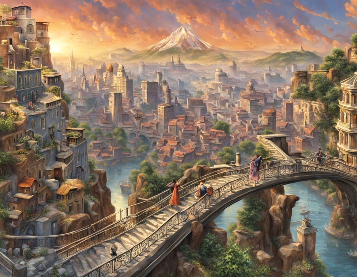 This image shows a fantastical city filled with countless stairs and bridges. The intricate architecture creates a mesmerizing and surreal urban landscape.