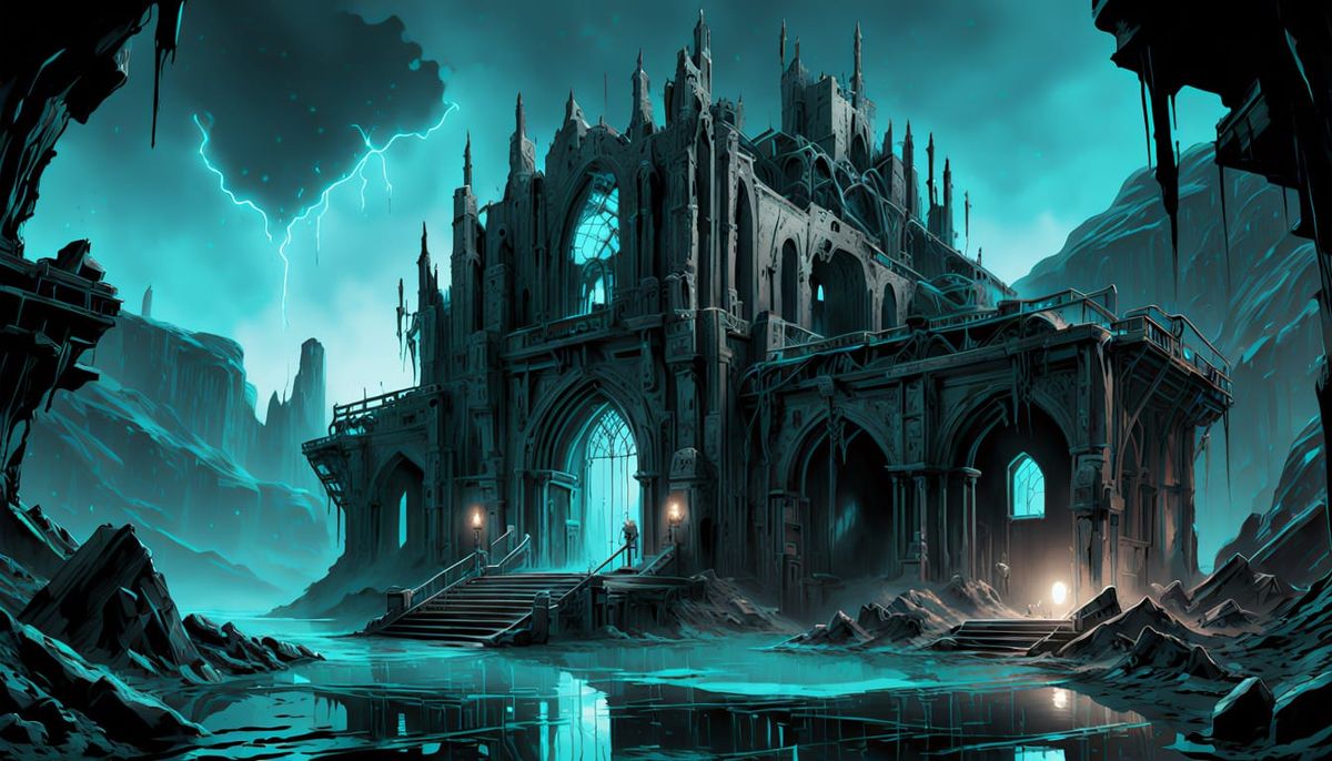 This image showcases a decaying gothic building in a dark, stormy setting, rendered in an ink wash digital illustration style with cyberpunk elements. It features stark contrasts and dramatic lighting.