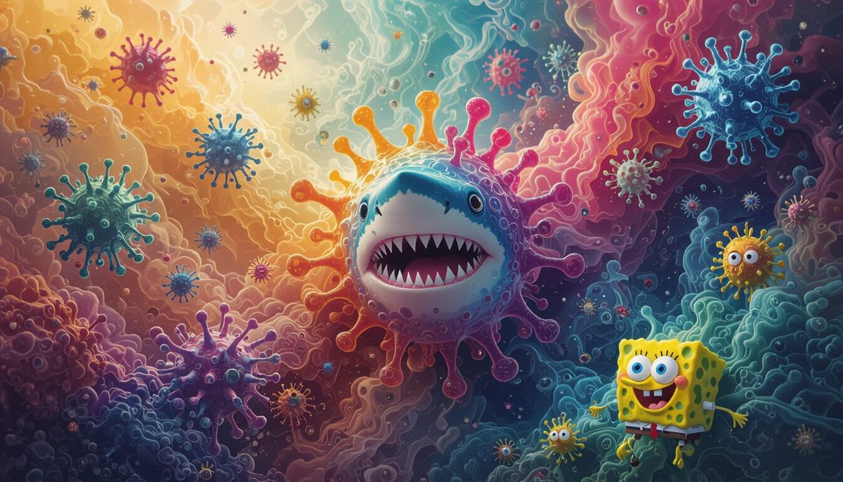 A realistic, lifelike photograph quality image displaying vibrant, translucent virus and amoeba forms with unique faces, rendered in detailed oil and alcohol ink streams with volumetric lighting.