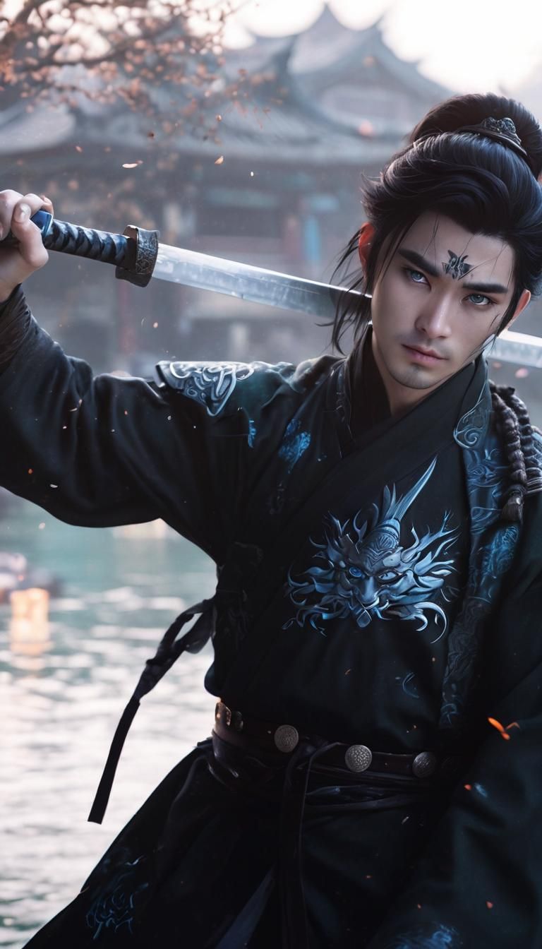 This image shows a young cultivator in a Chinese water temple, clad in dark green hanfu and light armor. Surrounded by magic blue flames, the figure holds a Chinese sword in a mystical, highly-detailed scene.