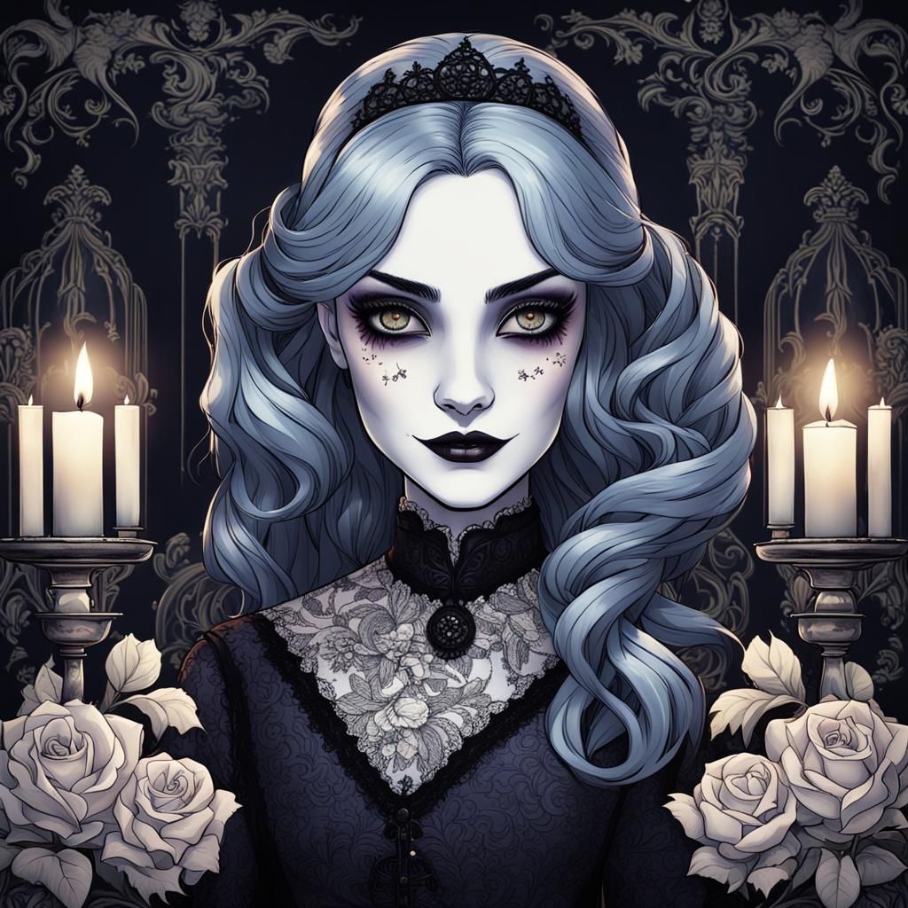 This image shows Morticia Addams with a sly smile, emphasized eyes, and candle-lit hair. The gothic background features shadowy florals and Victorian elements, rendered as vibrant digital art.