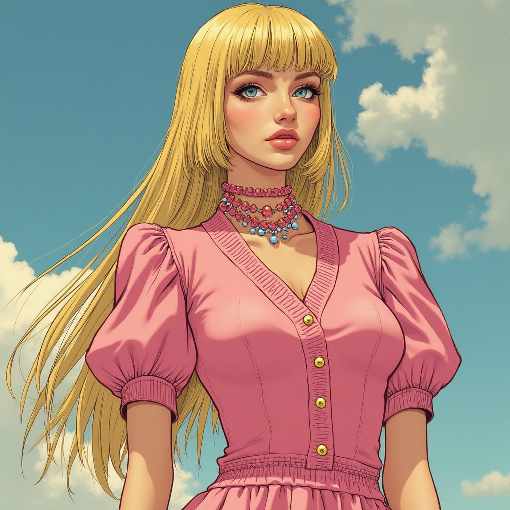 This vibrant comic art showcases a young woman in a stunning pink sweater, with intricate details and breathtaking composition, reminiscent of bande dessinée masterpieces.