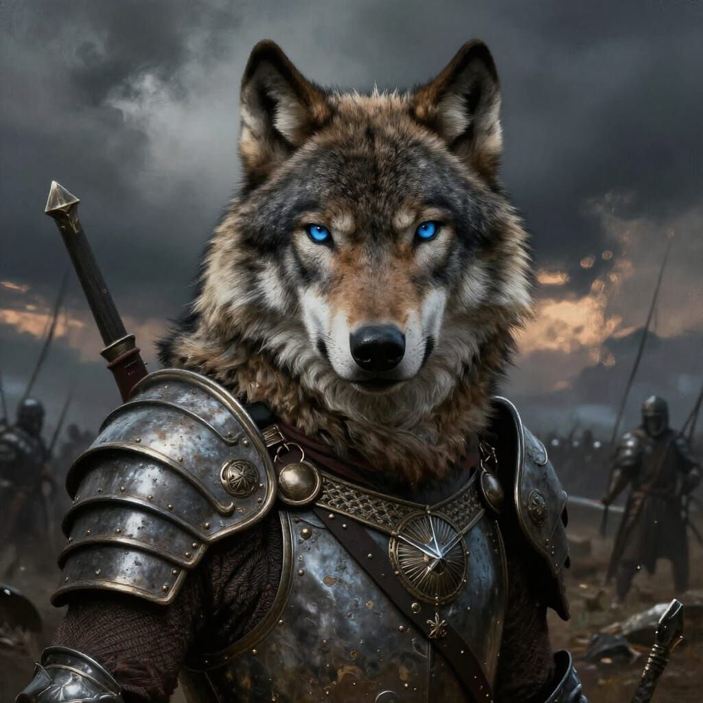 This image depicts a realistic wolf warrior in medieval armor on a dramatic battlefield at dusk. The artwork features rich textures and dynamic lighting in a gritty, painterly style.