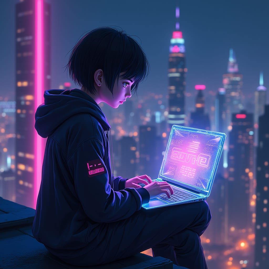 This image shows a girl with short black hair in a cyberpunk hoodie using a holographic laptop. The scene is set against a neon-lit futuristic cityscape with cinematic lighting.