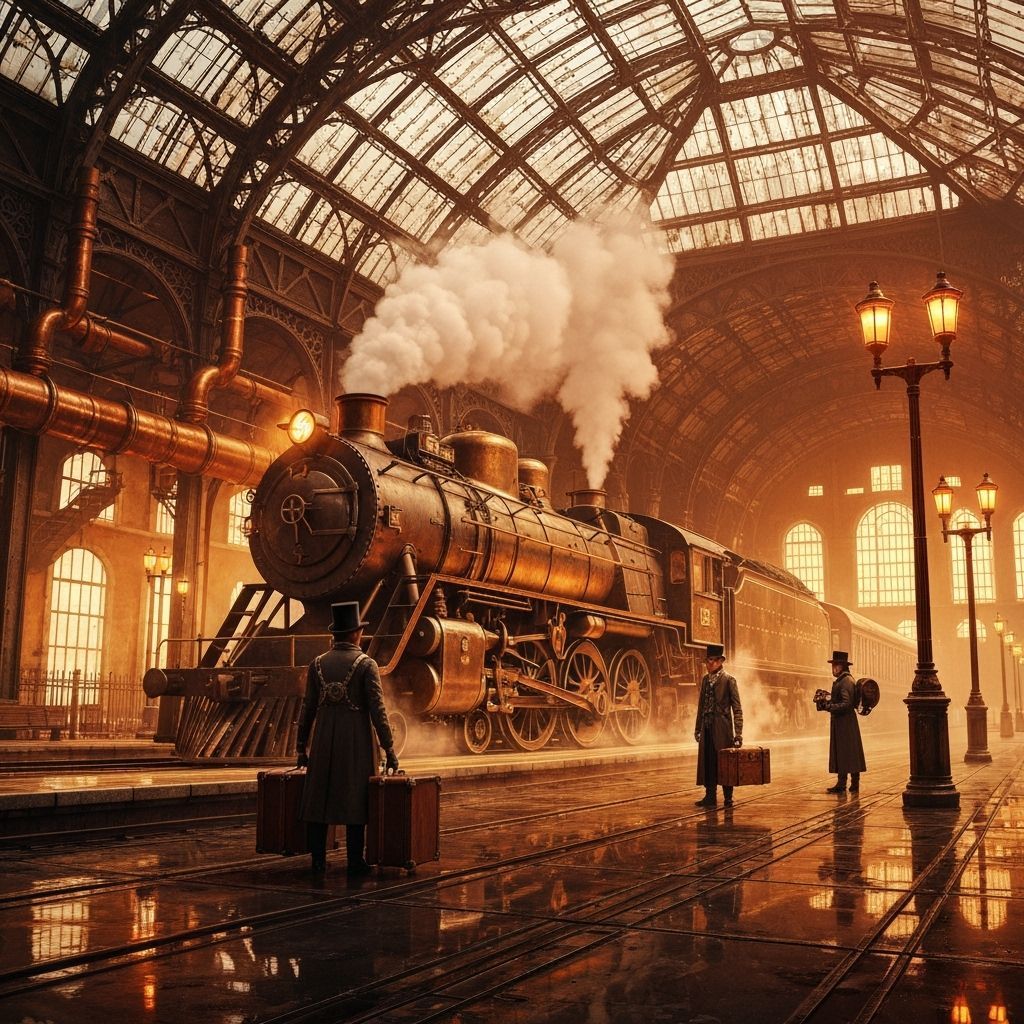 A massive steampunk train station beneath an iron and glass dome, featuring a colossal locomotive with brass details and steam. Dramatic lighting and vintage passengers create an adventurous atmosphere.