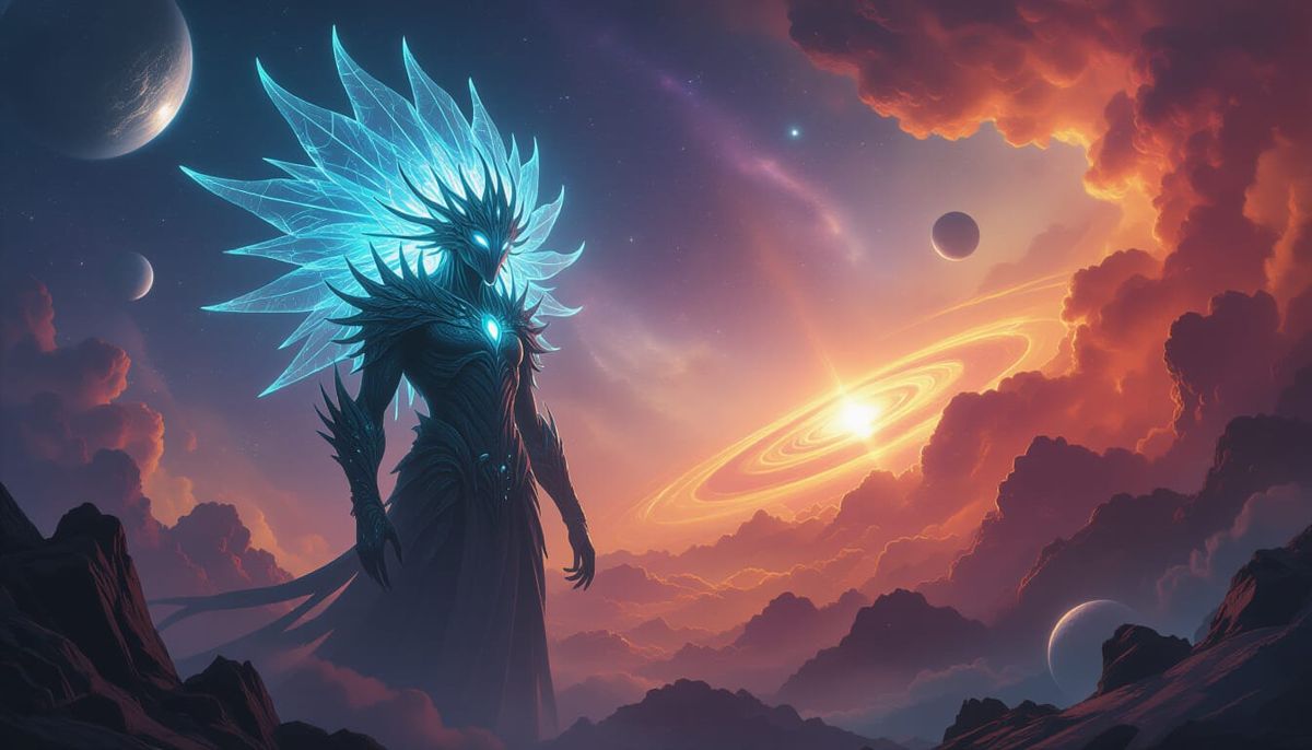 This image shows a colossal, glowing alien with crystal growths in a colorful nebula. The artwork features photorealistic detail and atmospheric depth, evoking epic concept art.