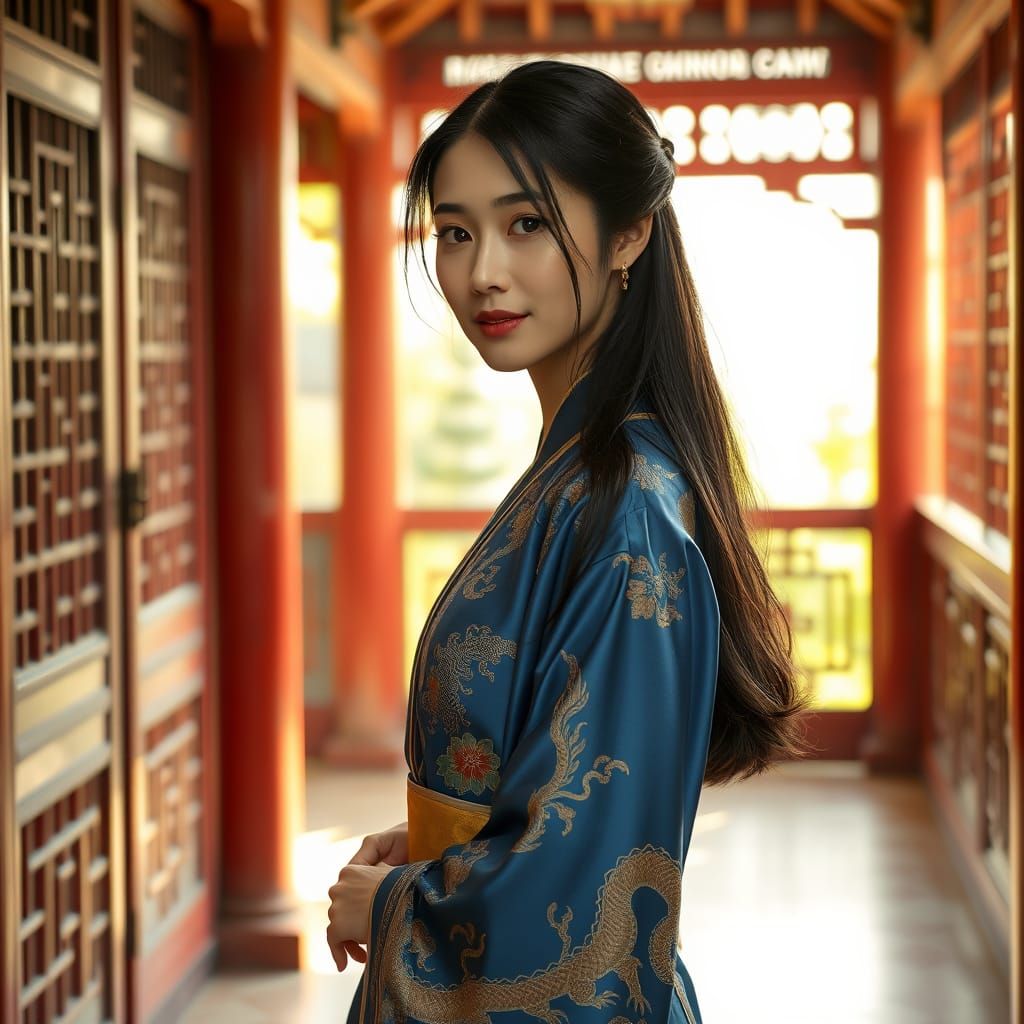 A serene woman stands in a tranquil ancient Chinese courtyard, adorned in a traditional blue hanfu robe with intricate golden dragon embroidery, surrounded by worn wooden pillars and delicate ceramic tiles, evoking the timeless elegance of traditional Chinese art.