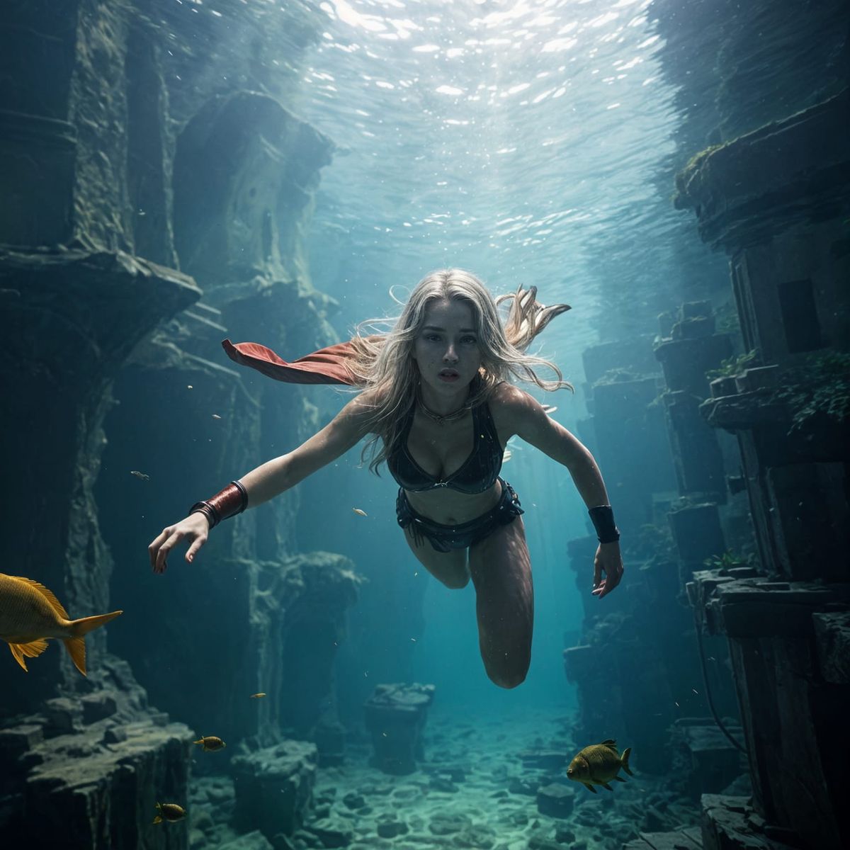 A striking picture of a silver-haired superheroine swimming through a submerged city. The background features decaying buildings and colorful fish, captured with macro photography and studio lighting to create a shallow depth of field.