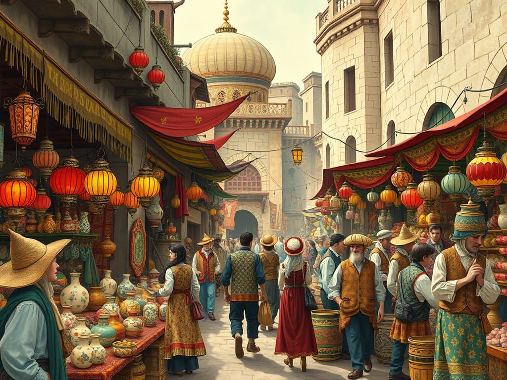A lively Ottoman market scene comes alive with intricate textiles, colorful lanterns, and ornate ceramics, set amidst ancient stone architecture, with merchants and traders enthusiastically hawking exotic wares in traditional attire.