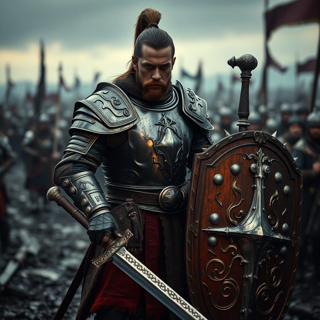 A battle-hardened warrior stands resolute on a muddy battlefield. The cinematic image, with dramatic lighting and film grain, captures the grim determination on his face as he wields a greatsword.