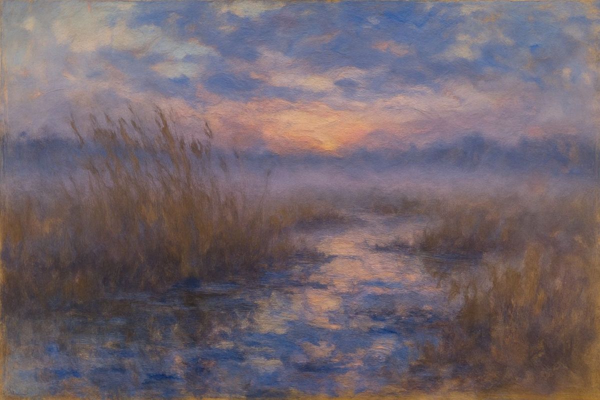 This Impressionist painting captures the serene atmosphere of a windswept coastal marsh at dawn, where pale lavender mist clings to golden reeds and soft clouds reflect in the still water.