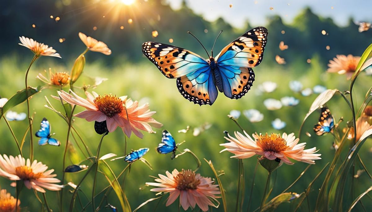 This digital matte painting captures colorful butterflies with iridescent wings amid lush flowers and grass. Features a clear blue sky and warm, whimsical lighting, rendered in a detailed, illustrative fantasy art style.