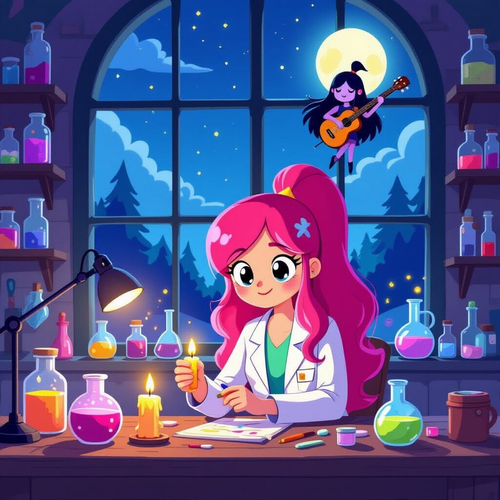 This image shows Princess Bubblegum making colorful candles in her workshop at night, with Marceline floating outside the window. Rendered in a whimsical, illustrative style.