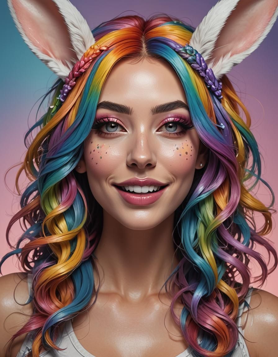A striking picture of a smiling young woman with rainbow-colored hair and rabbit ears. The image is hyperrealistic with intricate details, heavy makeup, and a colorful, dramatic background.