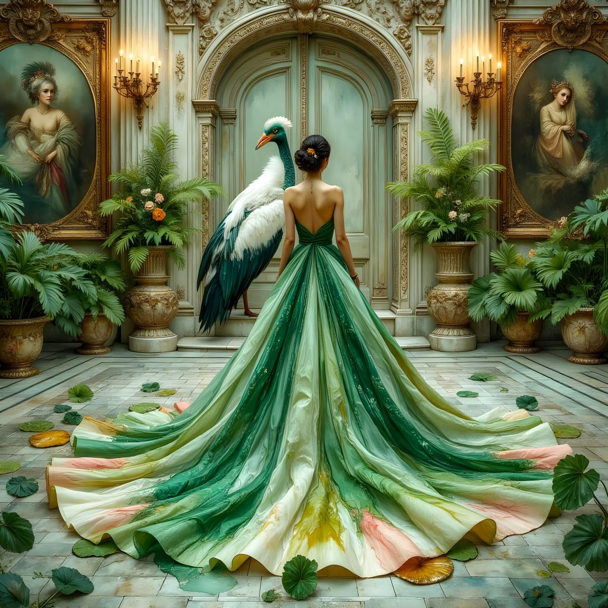 A striking picture of a woman in a striped dress standing in a ballroom with a large feathered bird. The artwork features dramatic lighting, shadows, and a colorful, textured aesthetic.