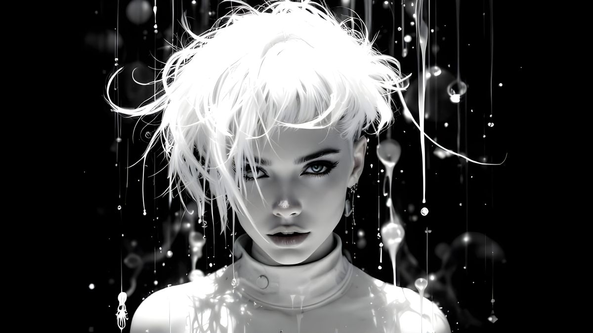 This image shows a person with an unusual white hairstyle. The image is highly detailed, with clear features enhanced by fine black ink, resulting in a crystal-clear, retouched appearance.