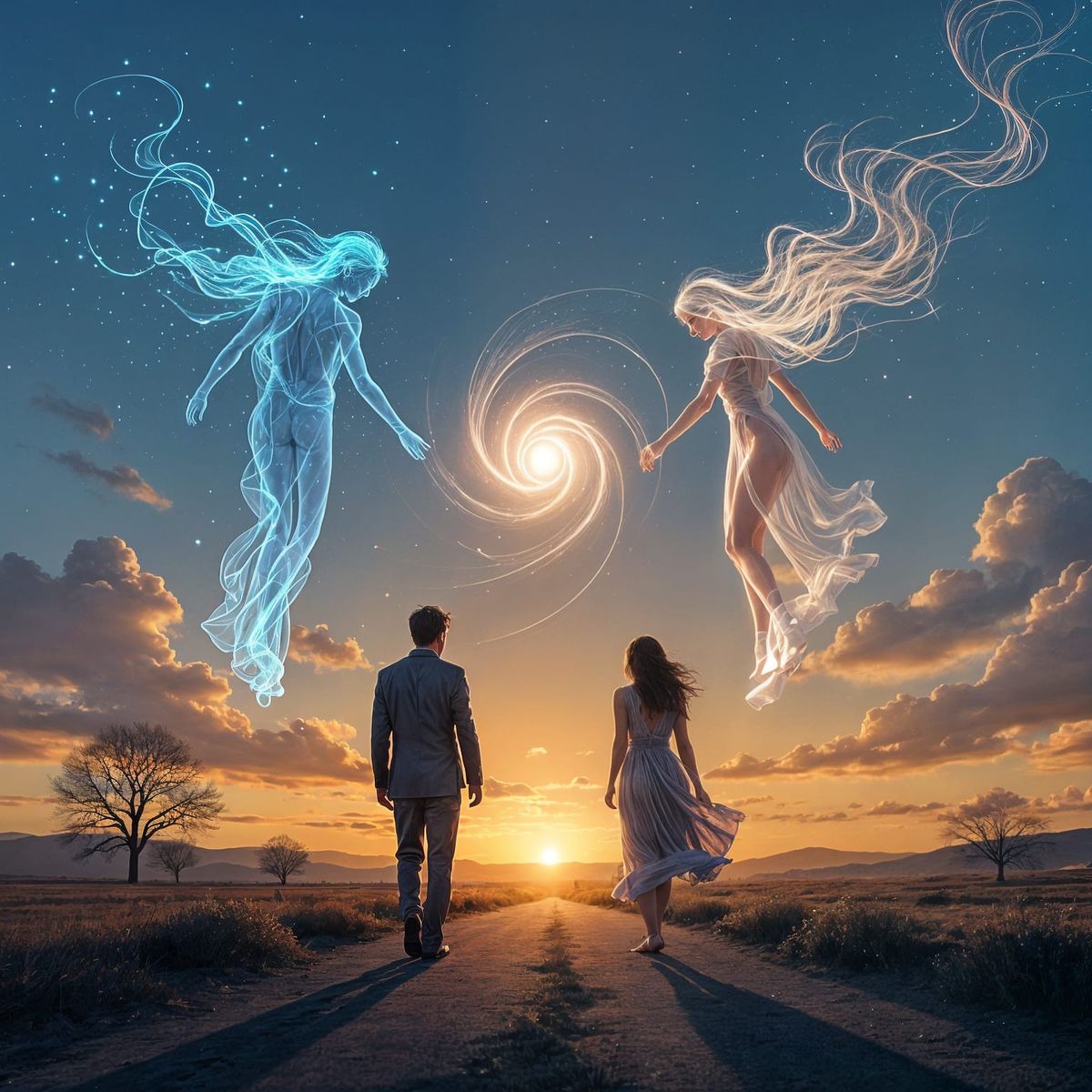 On a plain at dusk, two human figures walk slowly in opposite directions, their backs to each other: he moves to the left, she to the right. Their bodies are real, tangible, simply dressed, bathed in a golden light fading to blue. But above them, like translucent projections, hover their souls: luminous, ...