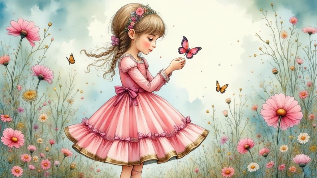 This image shows a sweet girl with braided hair holding a butterfly. She is wearing a pink dress in a whimsical style, with vibrant colors and delicate textures.
