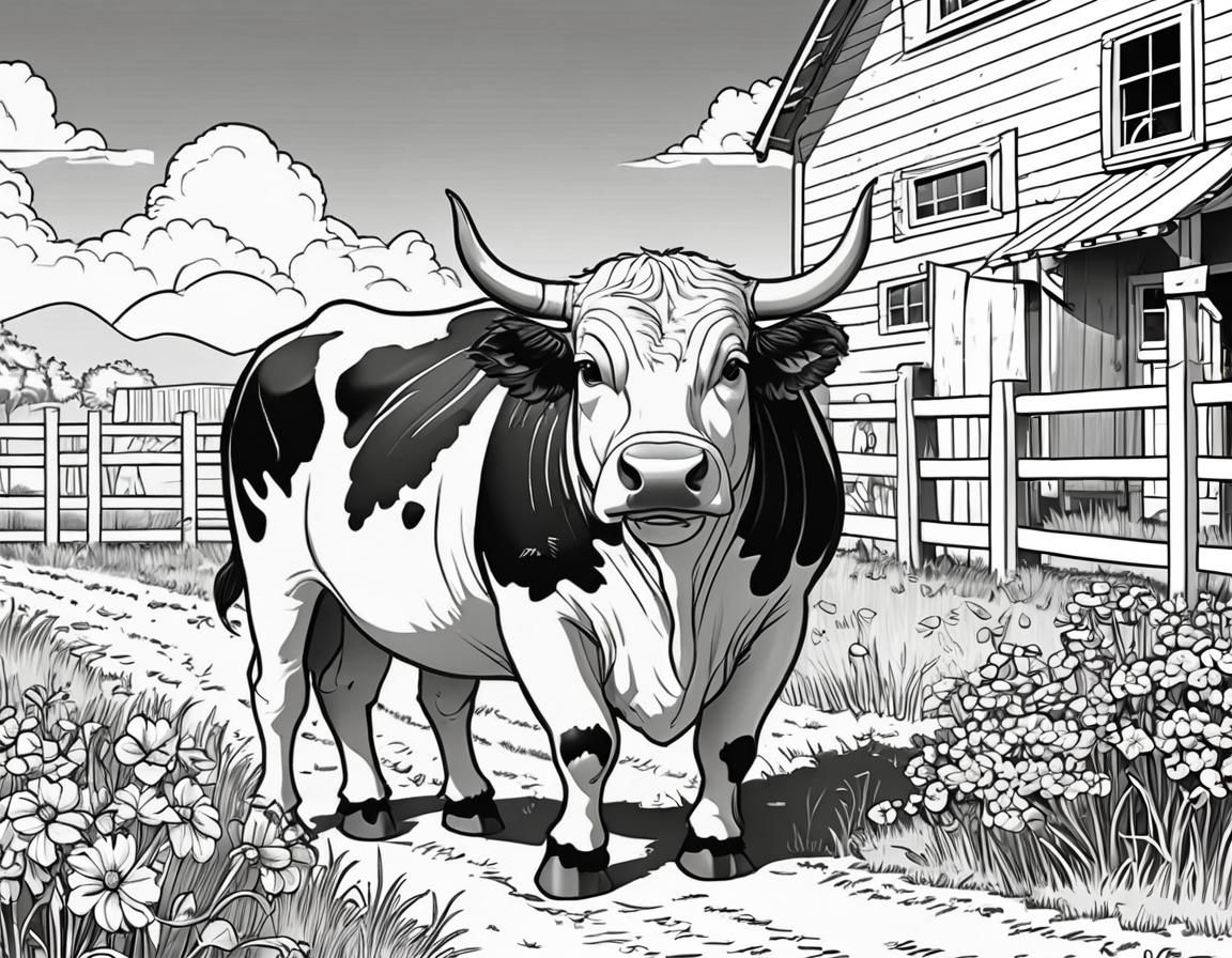 This image shows a black and white cartoon drawing of a bull in a farmyard setting, designed as a simple coloring-book page with clear line art details.