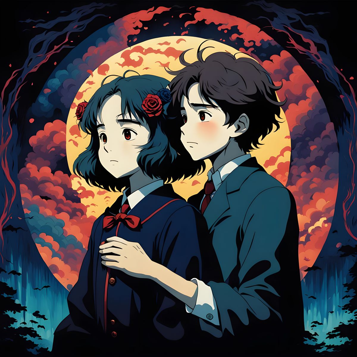 This image shows a gothic scene with romantic and mysterious elements. The artwork evokes a dreamlike quality with deep, analogous colors, reminiscent of dark anime and Studio Ghibli.